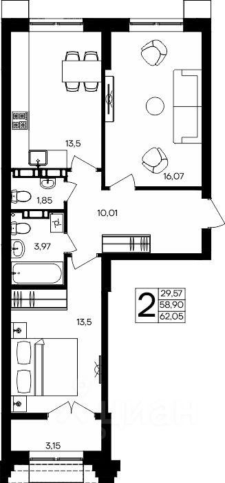 62 м² · Этаж 6 из 9