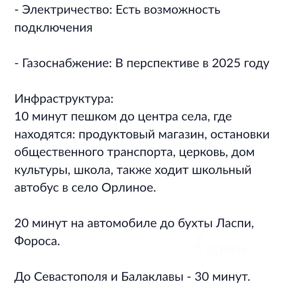 Участок 10 соток (СХ) расположен в г. Севастополь, Балаклавский район, село Гончарное. Участок ровный, просторный, без уклона. Подъезд асфальтированный.Позвоните нам, чтобы узнать все детали! Коммуникации: -Электричество: рядом-Вода: делать скважинуУчасток сельскохозяйственного назначения, расположен вдоль основной трассы около села Гончарное.Кадастровый номер 91:01:033001:954Инфраструктура: Участок находится вдали от городской суеты, но при этом, вблизи необходимой социальной инфраструктуры. Расстояние до г. Севастополь - 20 км.Подходит для наличного расчета.Документы проверены юристами и готовы к сделке.Профессиональное сопровождение до получения права собственности. Добавьте предложение в закладки, чтобы не потерять!
