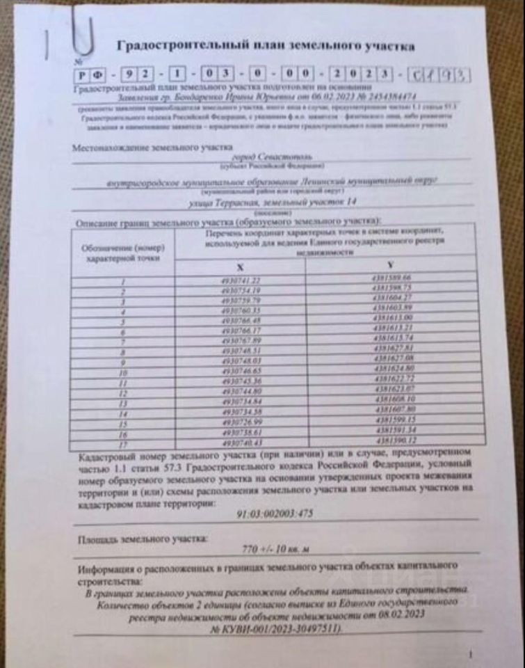 Объект 5155. Продаётся земельный участок 10 соток в Гагаринском районе Севастополя! Полное пятно застройки, ГПЗУ на руках. Адрес: г. Севастополь, Гагаринский р-н, Крепостное ш., 27/39 Кадастровый номер: 91:02:005006:432 Площадь: 1000 кв. м (10 соток) Назначение: земли населённых пунктов, разрешённое использование — ведение дачного хозяйства (код 13.3) Преимущества: Частная собственность Подключённое электричество (Севэнерго) Удобный подъезд — 450 м от Фиолентовского шоссе по широкой грунтовой дороге Перспективный район с развитой инфраструктурой Документы: Право собственности оформлено, готовы к сделки. Любые виды расчетов. ГПЗУ полное пятно застройки. Отличный вариант для строительства дома!