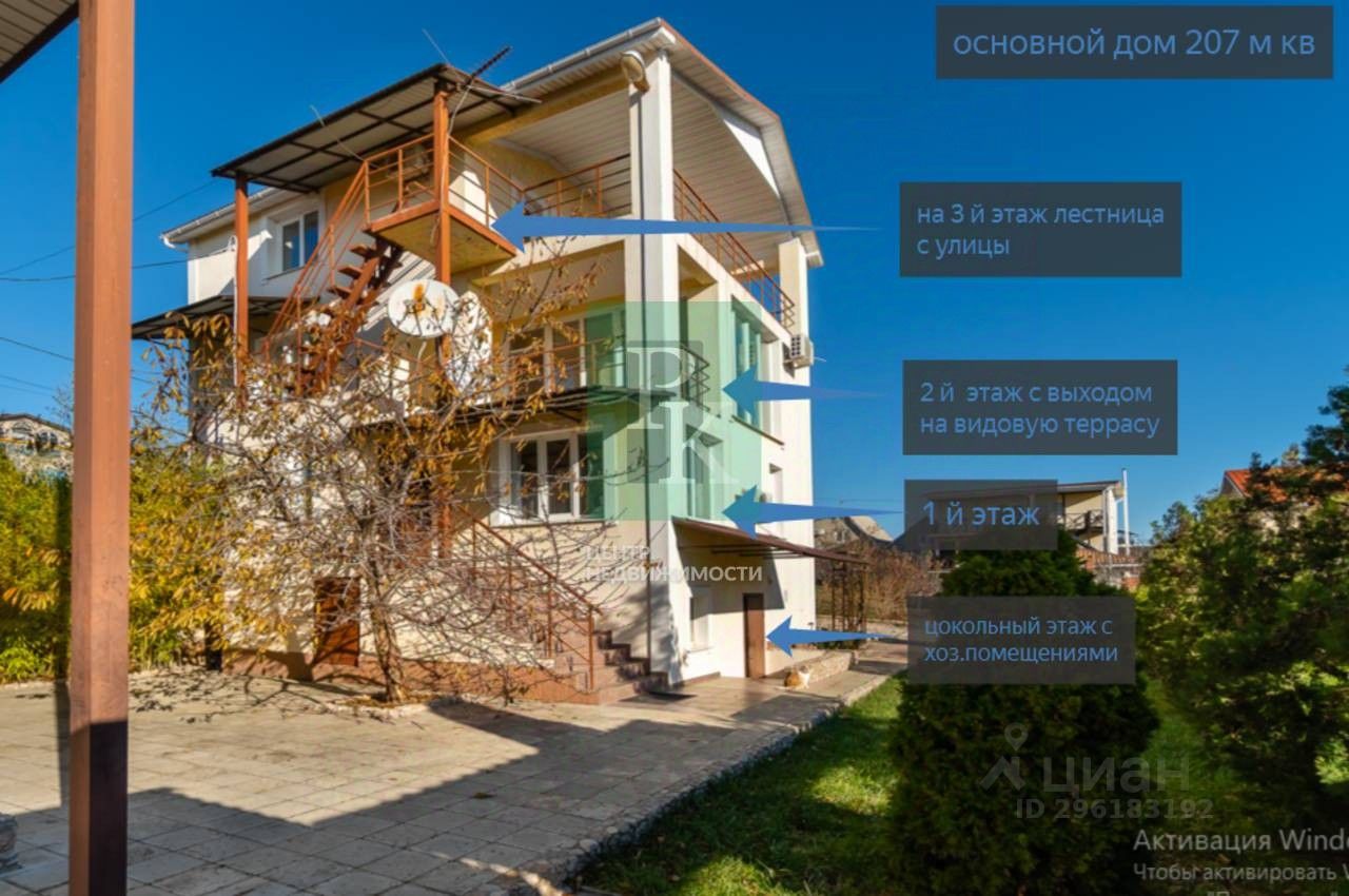 -Всего 4 этажа (включая цоколь): -Цоколь: прихожая-коридор, совмещенный санузел и комната -1 этаж: коридор-прихожая, кухня с кладовой комнатой, зал, совмещенный просторный санузел, лестница на второй этаж -2 этаж: кабинет-гостиная с выходом на просторный балкон, панорамными окнами и видом на море, две спальни -3 этаж: два гостевых номера с совмещенными санузлами Технические характеристики гостевого дома: