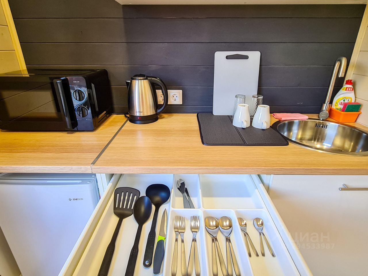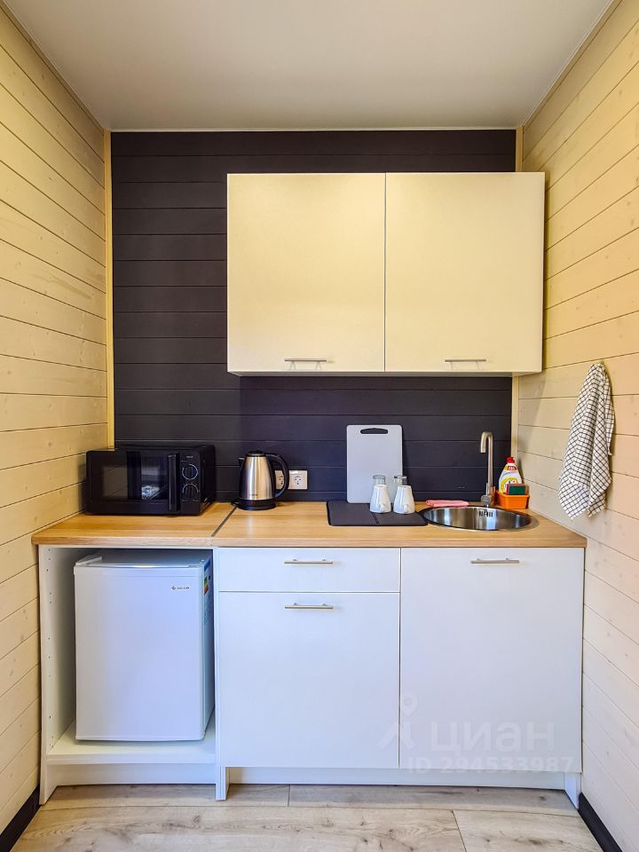 полноценная кухню с холодильником, микроволновкой, чайником, электро-плитой и обеденным столом