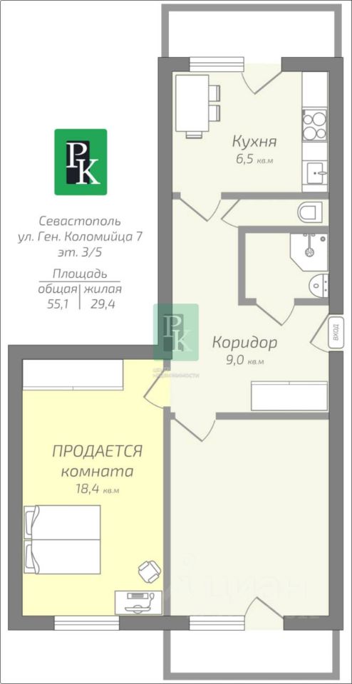 -Адрес: г. Севастополь, Ленинский район, ул.Генерала Коломийца, д. 7. -Год постройки дома: 1977 -Этаж/этажность: 3/5 -Количество комнат: 2 -Комнаты: изолированные -Площадь комнаты: 18,4 м2 -Площадь кухни: 7 м2 -Высота потолка: 2,5 м -Санузел: раздельный -Водоснабжение: центральное -Горячее водоснабжение: бойлер -Отопление: центральное Дополнительная информация: Квартира общей площадью 55,1 м2. Все комнаты раздельные. В продаже - 18,4 м2. В ванной комнате поменяны трубы, в туалете сантехника. Дом построен в 1977 году из инкерманского камня. Во дворе всегда найдется парко место, а также установлены камеры для авто. Обустроены детские и спортивные площадки. Позвоните нам, чтобы назначить просмотр! Инфраструктура: В пешей доступности школа 4, 7 и 22, детский сад 118, музыкальная школа, различные продуктовые магазины, несколько аптек, детская поликлиника, ТЦ ''Океан'', ТЦ ''Московский'', продуктовый рынок. Отличная транспортная развязка позволяет добраться в любой район города без пробок! Рядом находятся: проспект Генерала Острякова, ул. Коломийца, Маршала Геловани, Павла Силаева, ул. Хрюкина, Хрусталева и Лебедя. Подходит для наличного расчета. Документы РФ проверены юристами и готовы к сделке. Профессиональное сопровождение до получения права собственности. Добавьте предложение в закладки, чтобы не потерять! Для просмотра и получения дополнительной информации - звоните!