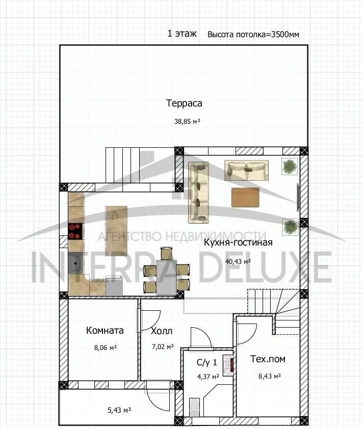 1-этаж: гардеробная/кабинет/гостевая комната, техническое помещение, санузел, кухня-гостиная с панорамным остеклением и выходом на террасу для встречи большой семьи или теплой компании.