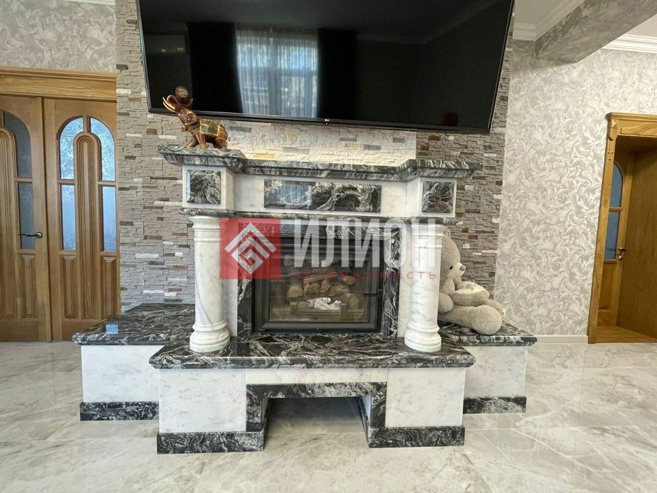 - На первом этаже расположены большая кухня с выходом на территорию к бассейну, коридор, гостиная комната с камином, санузел с душевой и отдельная спальня.