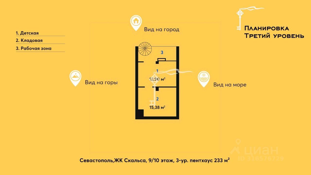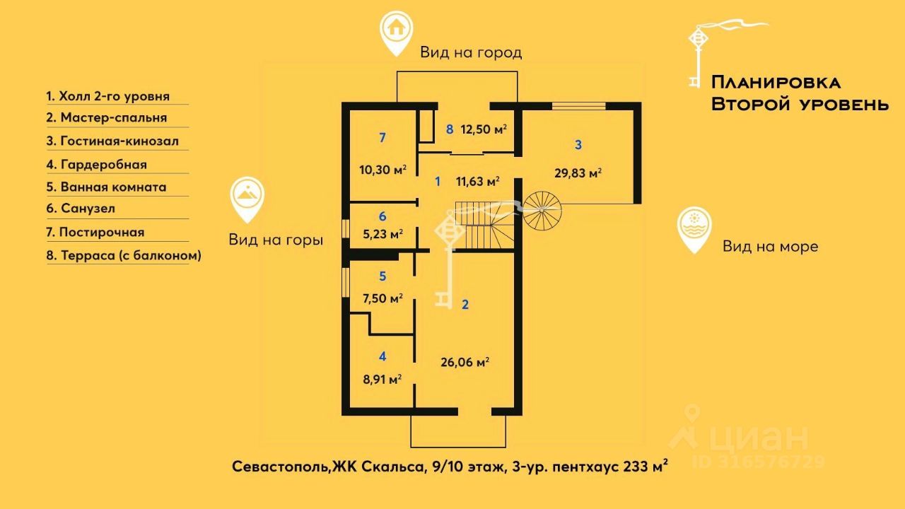 Продажа стильного видового трехуровневого пентхауса с домашним кинотеатром и паркоместом, расположенного на последних этажах в престижном жилом комплексе Скальса в Севастополе.