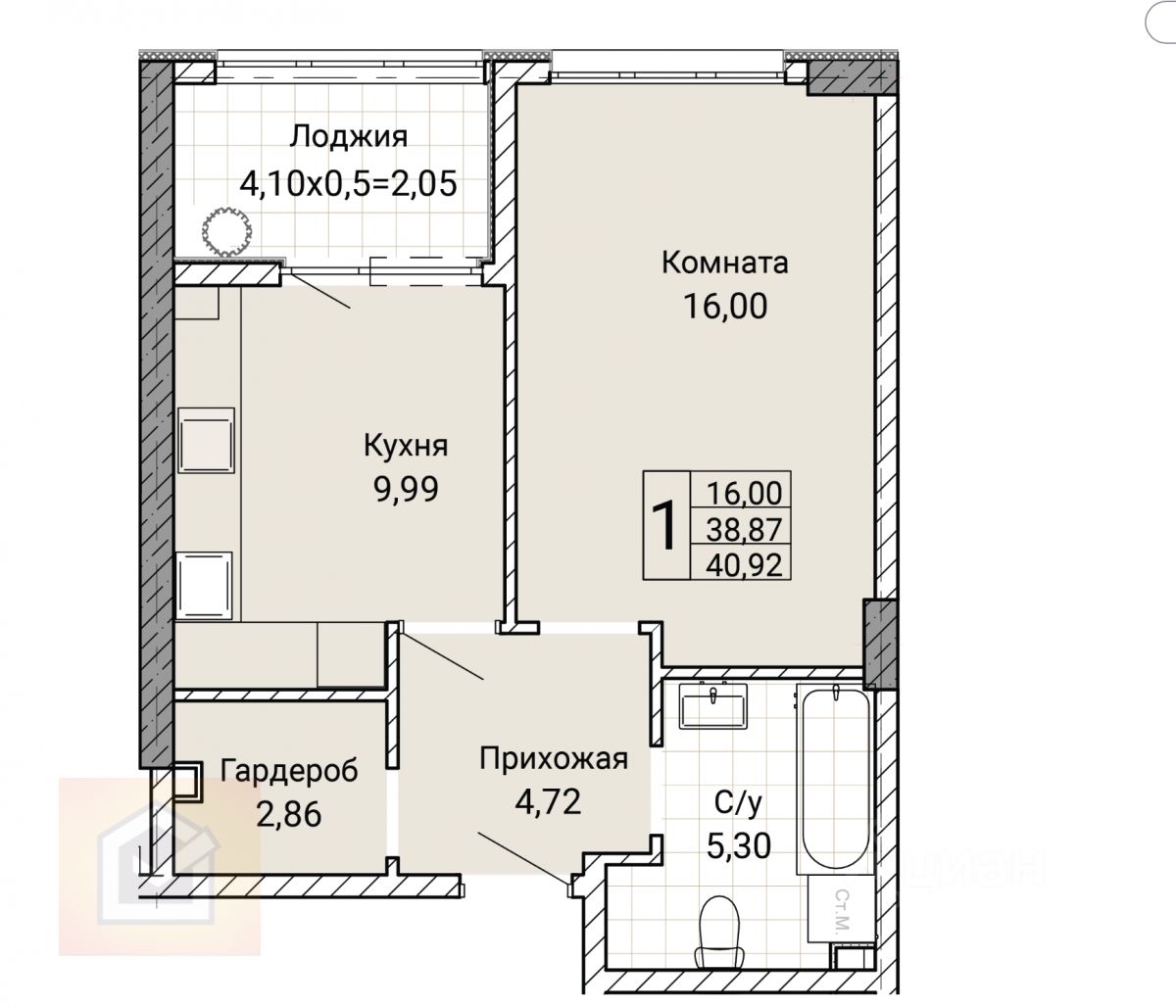 Общая площадь : 40.92 м2 Жилая площадь : 16 м2 Кухня : 10 м2