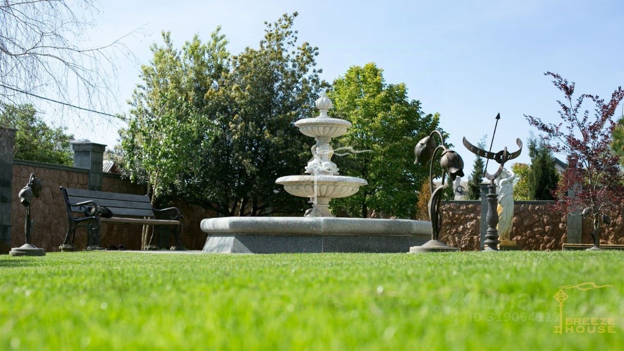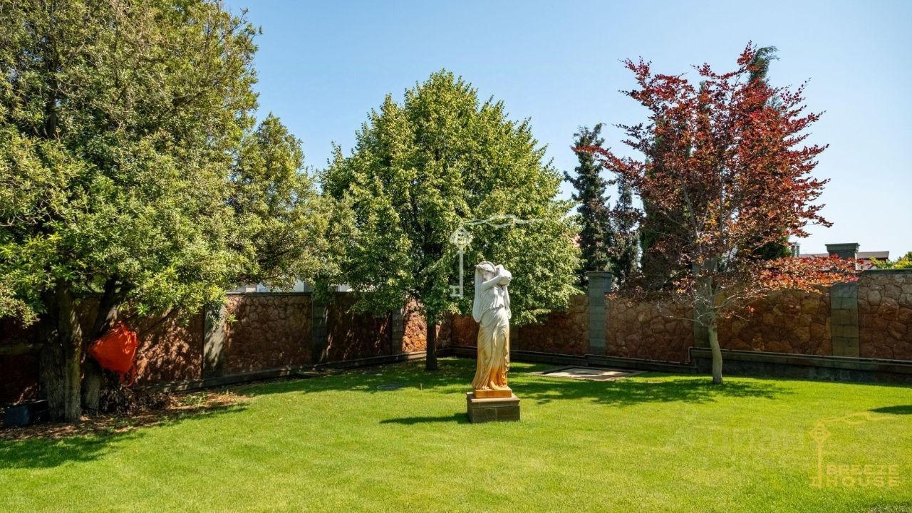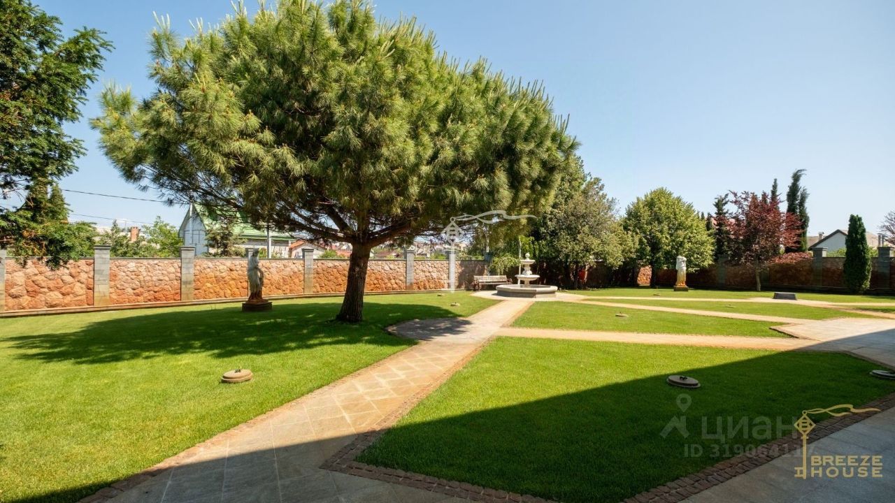 Автоматическая система капельного полива обслуживает весь сад. Наружная отделка дома выполнена из альминского камня, кровля — из натуральной черепицы. Для технического обслуживания под всем домом предусмотрен полноценный техэтаж и чердачное пространство.