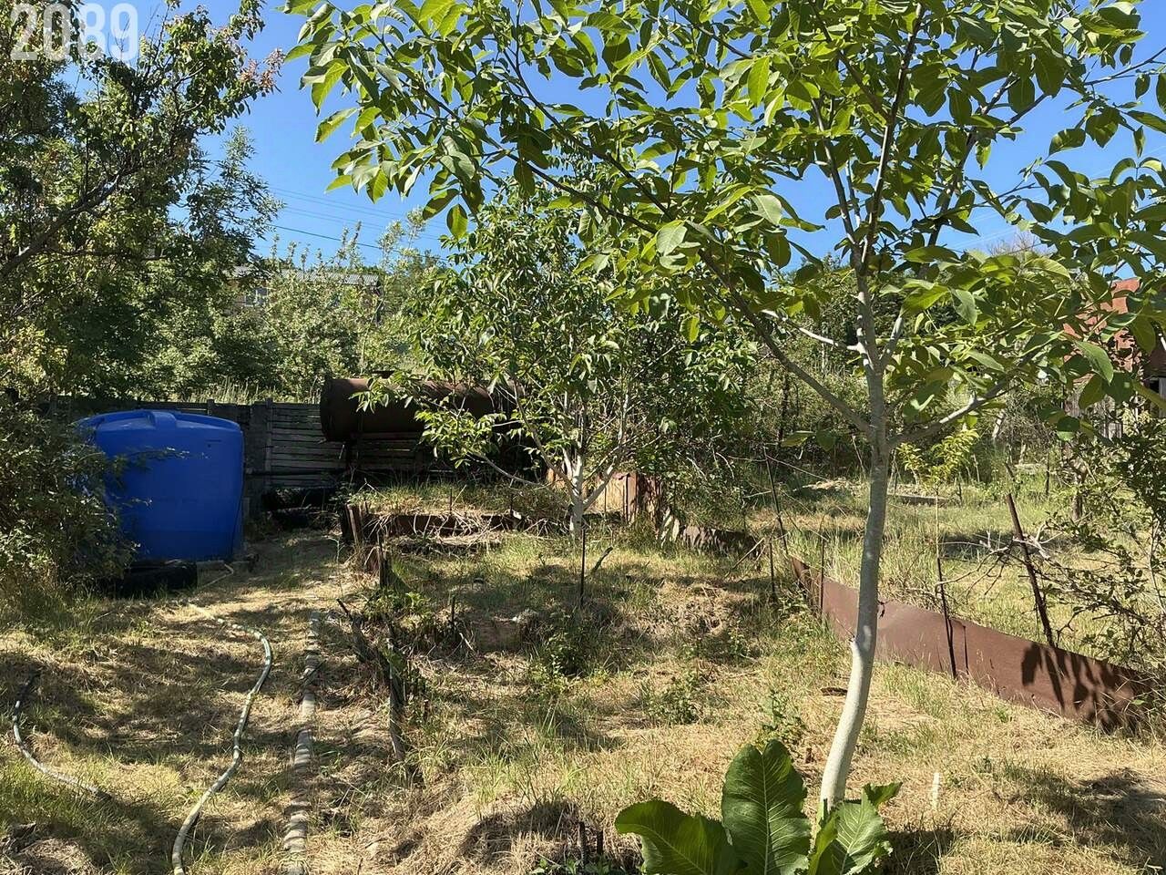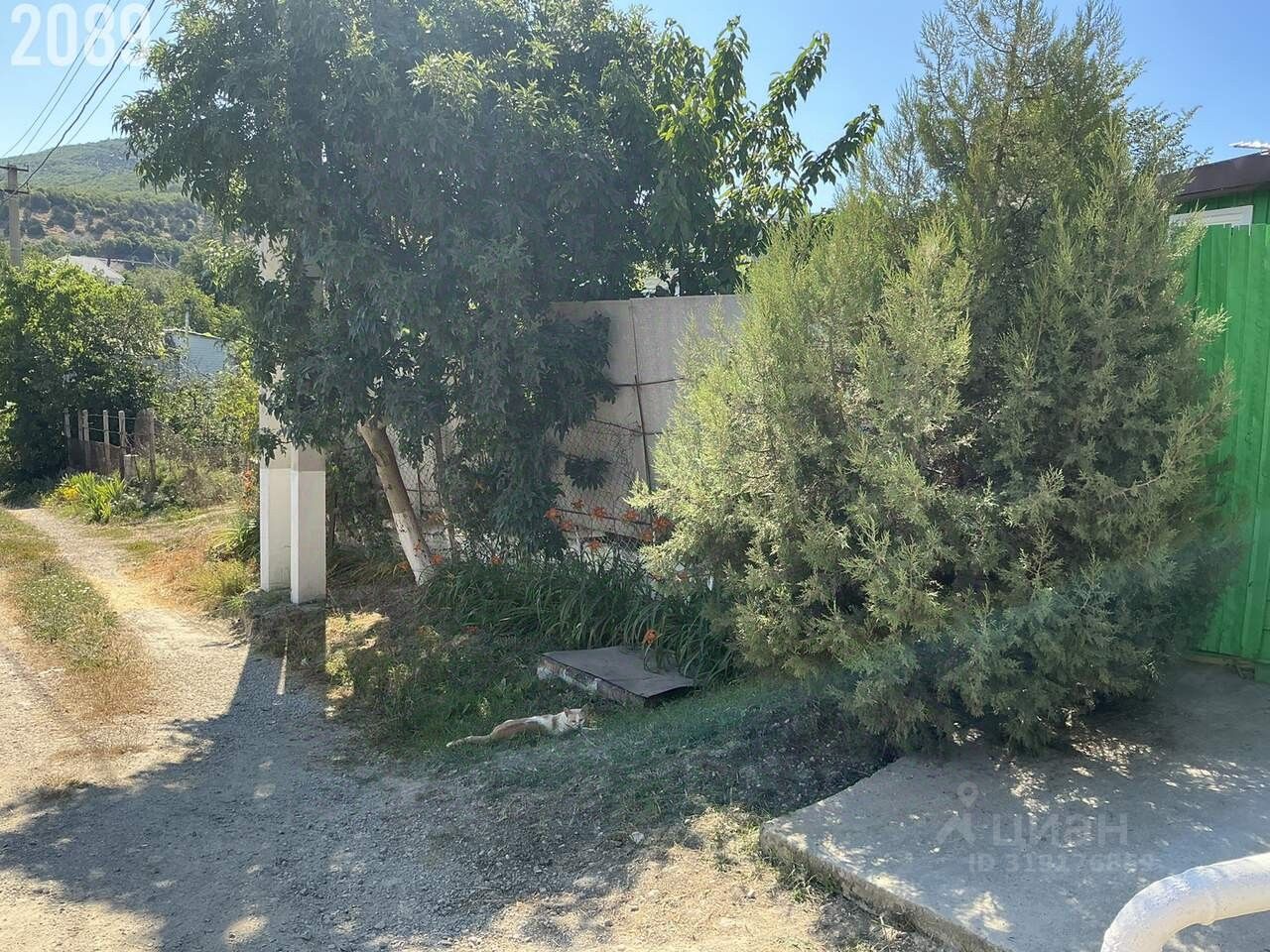 Растут плодовые деревья, бетонированная площадка для парковки автомобиля.
