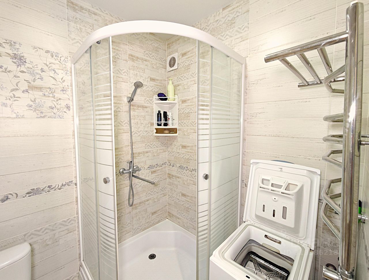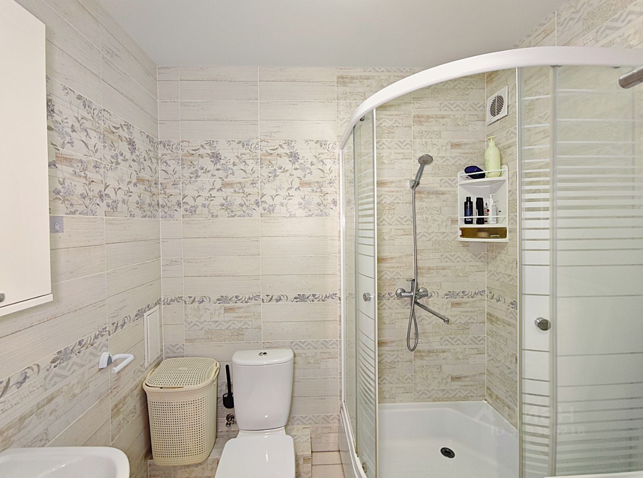 Санузел совмещенный, выполнен в светлых тонах.