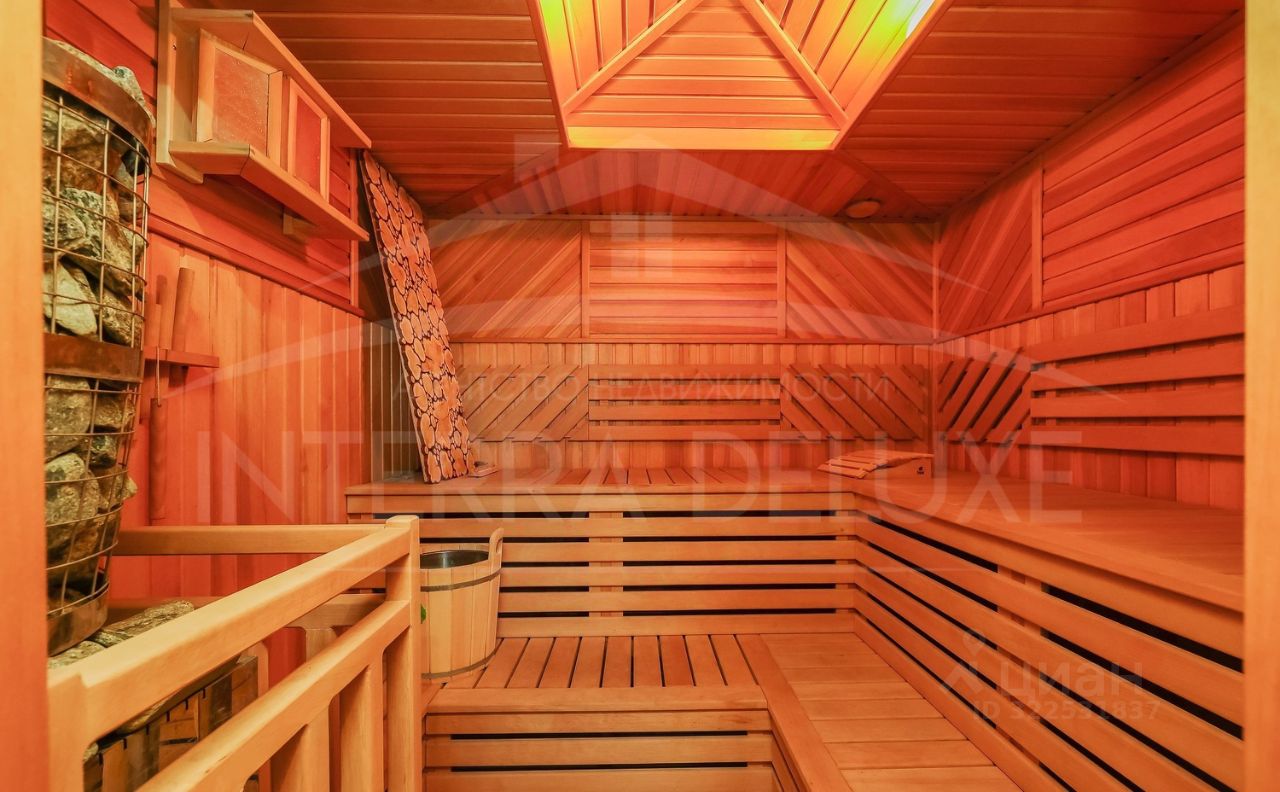 Первый этаж: сауна на дровах с обливным ведром, соляная комната с гималайской солью, она же комната отдыха с камином.