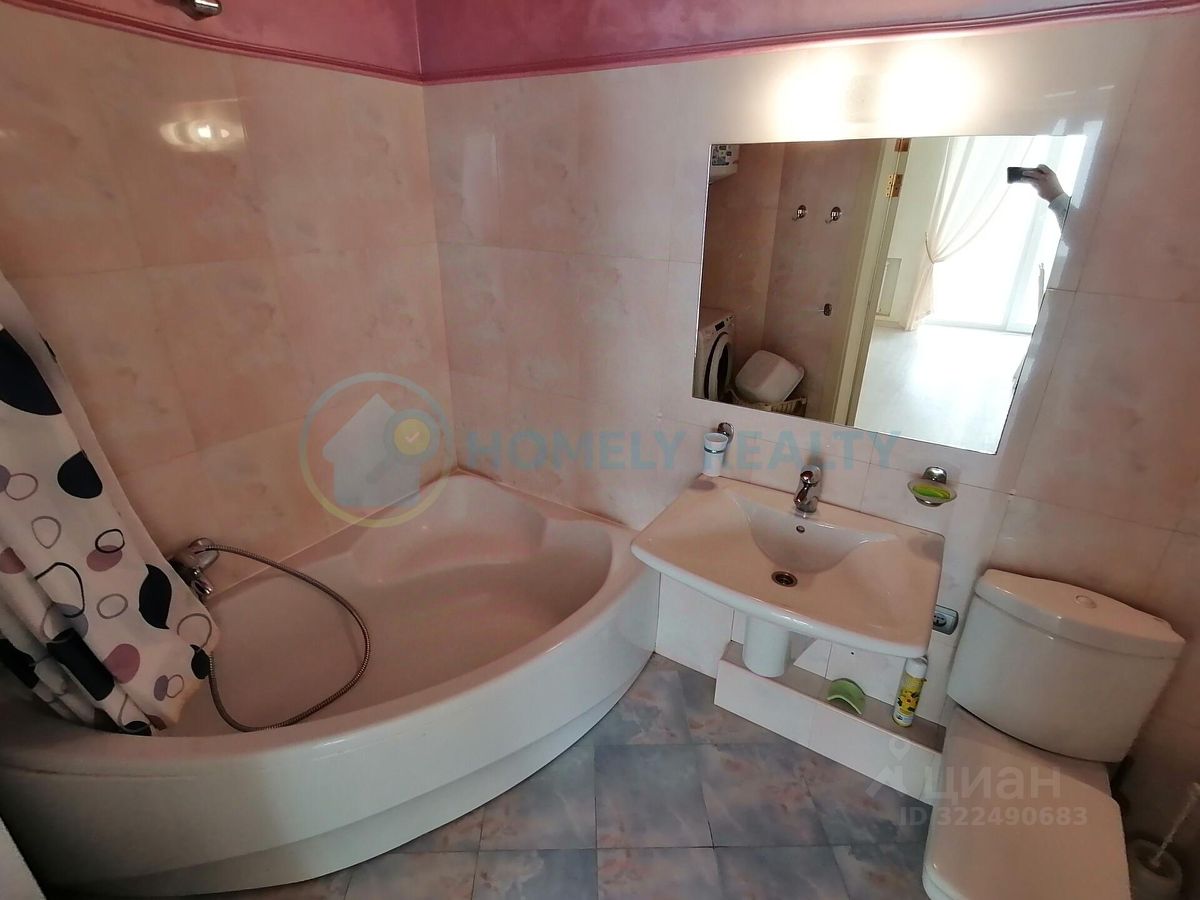 О квартире: — Площадь: общая — 46.5 м² (с учётом балкона 8.3 м²), жилая — 20 м², кухня — 10 м². — Коммуникации: центральное отопление и водоснабжение, горячая вода от бойлера. — Планировка: студия с двумя выходами на большой балкон и совмещённым санузлом. Возможность легко создать изолированную комнату без больших вложений. — Ремонт: качественный с премиальными материалами: — Стены: венецианская штукатурка OIKOS ''Ottocento''. — Пол: свежий ламинат. — Санузел: угловая ванна, сантехника Roca, итальянская плитка. Оснащение: — Техника: встроенная кухня с плитой Siemens (газ/электричество). — Мебель: большой шкаф-купе в прихожей, встроенная кухня (остаётся новому владельцу). — Комфорт: два выхода на застеклённый балкон, цифровое ТВ, интернет. — Вид во двор с хвойными деревьями и фонтаном.