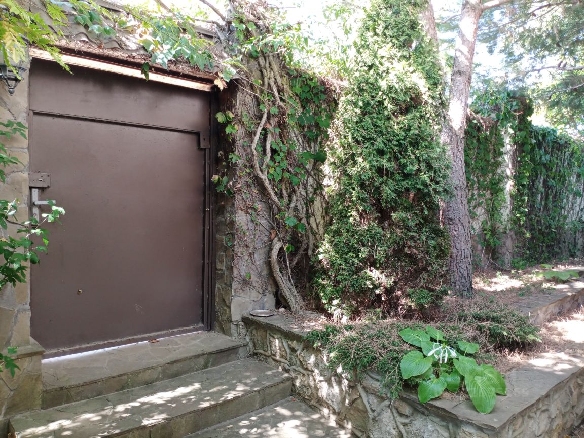 Добротные металлические входные двери, такие же ставни на окнах.