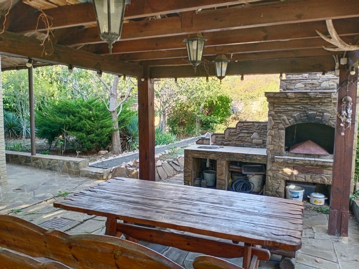 Очаг с кухонной зоной и крытой беседкой, стол на 10 человек с лавками, качель с подушками