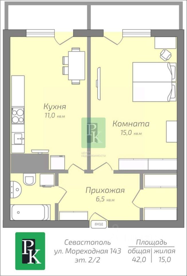 -Общая площадь - 42 м2 -Жилая площадь- 15 м2 -Площадь кухни -6 м2 -Высота потолков -2,7 м -Санузел -1 совмещенный -Балкон/лоджия -1 балкон -Вид из окон -на улицу и двор -Ремонт -Евроремонт -Продаётся с мебелью -Да Дополнительная информация: В продаже квартира с мебелью и техникой в частном доме. Закрытый озелененный двор с видеонаблюдением - теплый бассейн 30-35С круглый год - солевая сауна , 2-х этажная беседка с мангальной зоной и видом на бухту - парковка предусмотрена для каждой квартиры - холодная кладовая для хранения овощей и фруктов - балкон и панорамные окна. Позвоните нам, чтобы назначить просмотр! Инфраструктура: Район спокойный, вдали от шумных дорог и высоток, экологически чистый, вокруг природа и много зелени. Рядом магазины, аптека, школа, детский сад, церковь, почта, остановки общественного транспорта, игровые детские площадки. До центра 8 км. В 15 минутах пешей прогулки находится причал ''Троицкий'' для любителей рыбалки. Там есть малый пляж. Подходит для наличного расчета, под ипотеку, материнский капитал, жилищные сертификаты. Документы РФ проверены юристами и готовы к сделке. Профессиональное сопровождение до получения права собственности. Добавьте предложение в закладки, чтобы не потерять! Для просмотра и получения дополнительной информации - звоните!