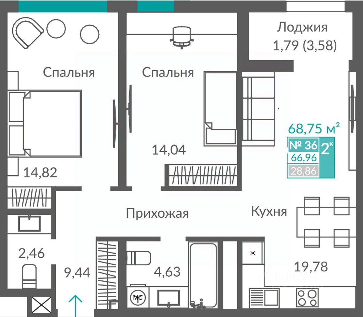 Общая площадь66,96 м2