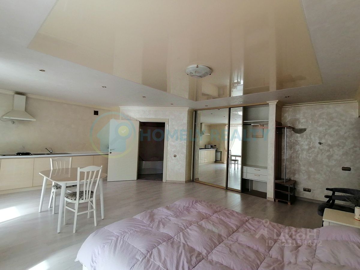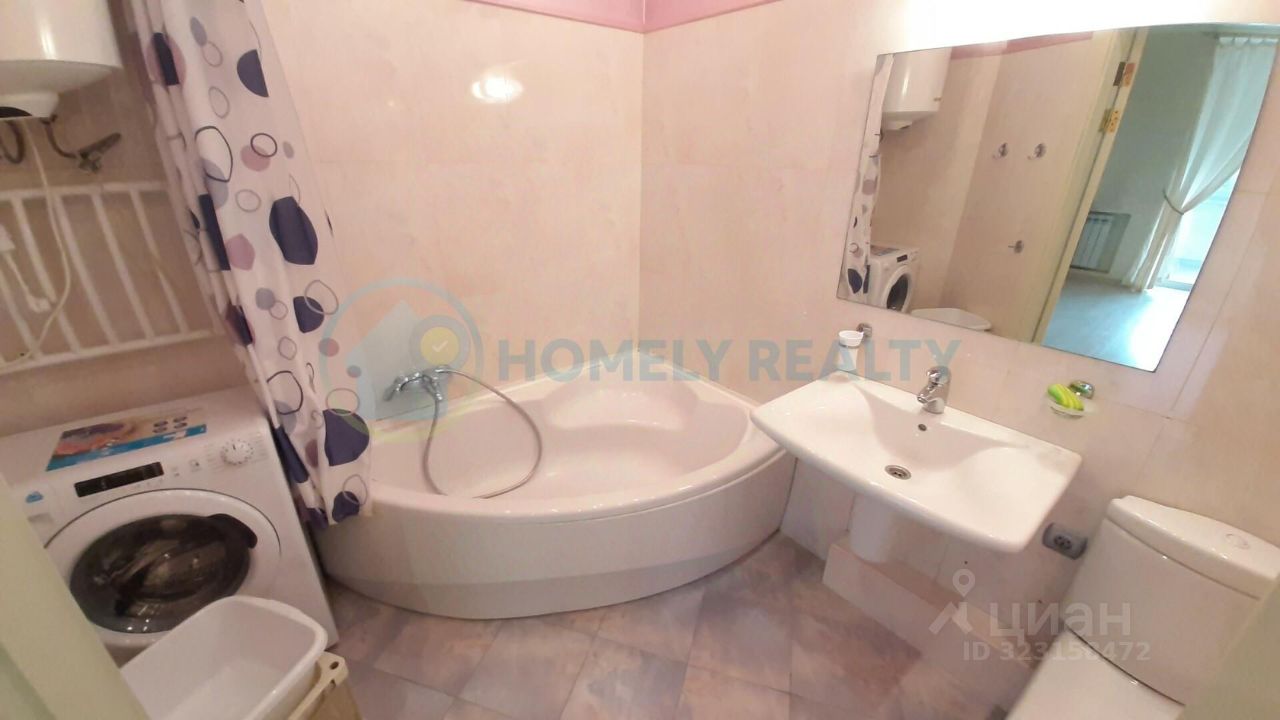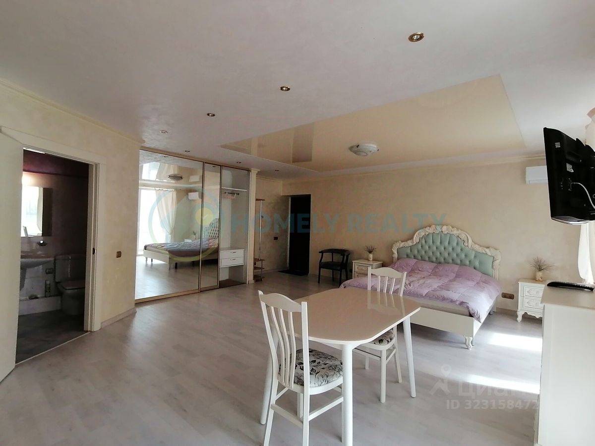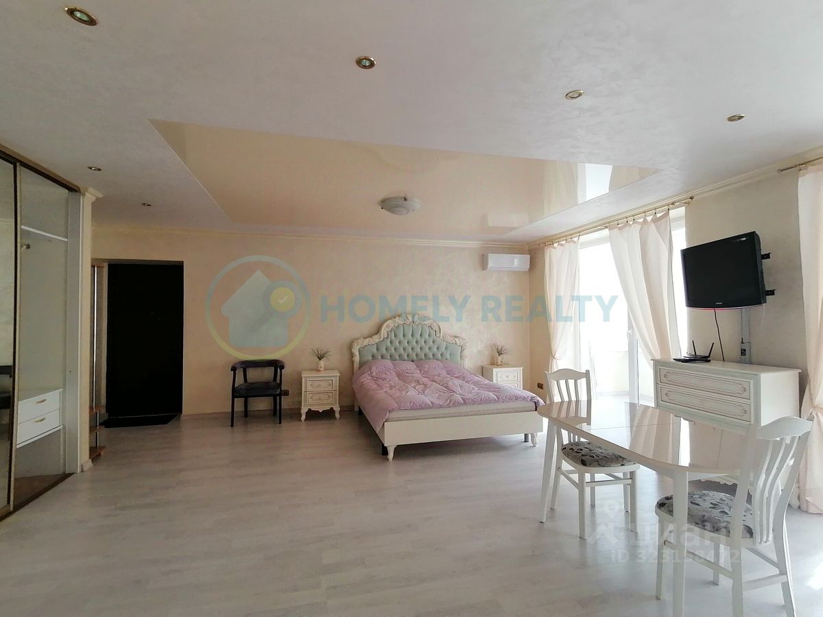О квартире — Площадь: 38.2 м² + застеклённый балкон 8,3 м² вид во двор. — Ремонт: дизайнерский (итальянская плитка, венецианская штукатурка OIKOS) на полу ламинат. Планировка: — Студия с зонированием. — Совмещённый санузел (сантехника Roca). Оснащение: — Техника: кондиционер Daikin, варочной поверхностью SIЕМЕNS (газ-электро), холодильник, СВЧ, ЖК-телевизор, бойлер. — Мебель: двуспальная кровать, большой шкаф-купе, комод, журнальный стол. — Дополнительно: посуда, сушилка для белья, постельное бельё, Wi-Fi, утюг, гладильная доска.