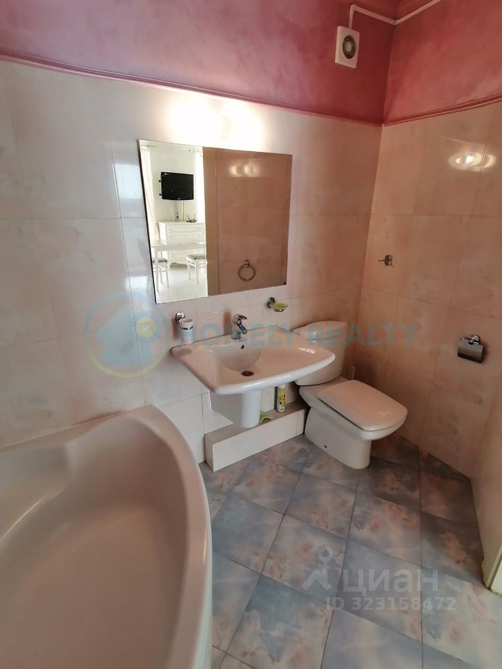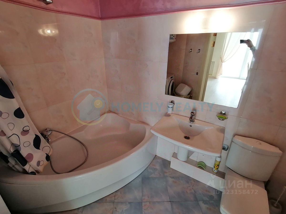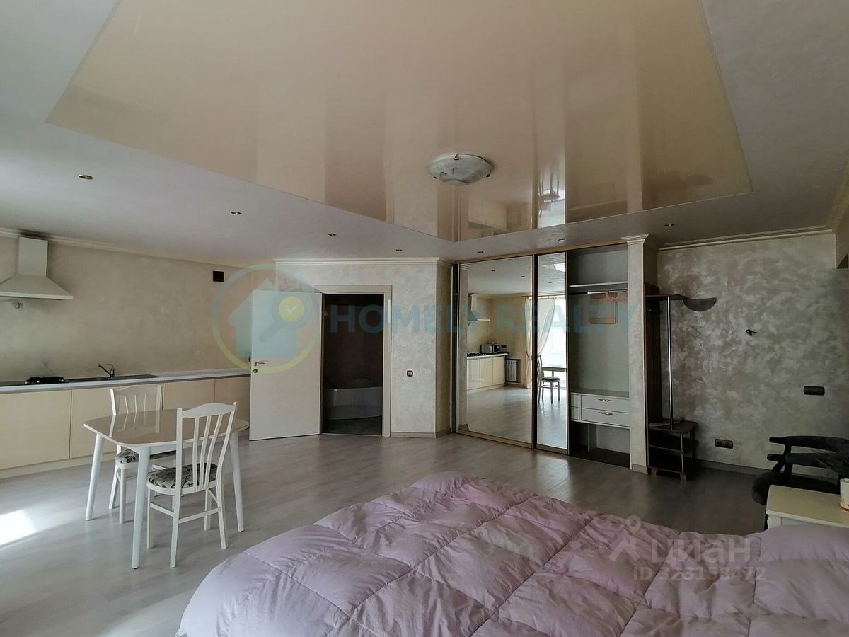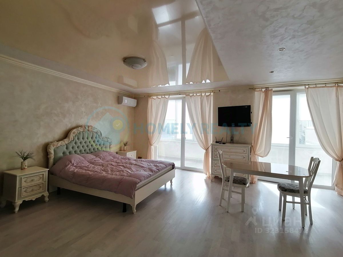 О квартире — Площадь: 38.2 м² + застеклённый балкон 8,3 м² вид во двор. — Ремонт: дизайнерский (итальянская плитка, венецианская штукатурка OIKOS) на полу ламинат. Планировка: — Студия с зонированием. — Совмещённый санузел (сантехника Roca). Оснащение: — Техника: кондиционер Daikin, варочной поверхностью SIЕМЕNS (газ-электро), холодильник, СВЧ, ЖК-телевизор, бойлер. — Мебель: двуспальная кровать, большой шкаф-купе, комод, журнальный стол. — Дополнительно: посуда, сушилка для белья, постельное бельё, Wi-Fi, утюг, гладильная доска.