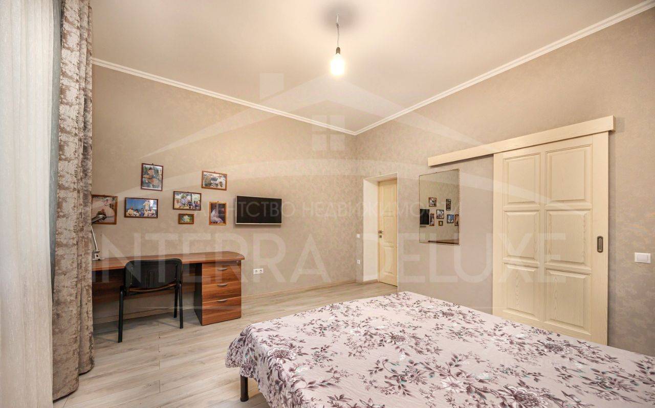1-й этаж - просторная кухня-гостиная со вторым светом и деревянной лестницей из ясеня, прихожая, совмещенный с/у, две изолированные спальные комнаты, в одной из которых есть своя гардеробная,