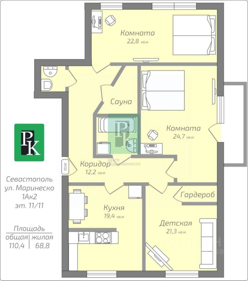 Видовая 3-комнатная квартира в Севастополе! Продаётся просторная квартира 110,4 м² на 11 этаже 11-этажного дома, расположенная в Гагаринском районе по адресу: ул. Александра Маринеско, д. 1А, корп. 2 Преимущества: Из каждого окна открывается панорамный вид на город Кухня 20,8 м² — мечта любой хозяйки Изолированные комнаты (22,3 / 24,4 / 22,1 м²) Высокие потолки — 3 метра Раздельный санузел, теплые полы, кондиционеры Дом монолитно-каркасный, крыша утеплена О доме и районе: Ухоженный и тихий двор Современные детская и спортивная площадки Рядом: школы, детские сады, ТЦ ''Метро'', ''Акварель'', ''Добрострой'', рынок ''Шевченковский'' Отличная транспортная доступность: рядом остановки автобусов 16, 110, 83 Документы РФ проверены юристами, готовы к сделке. Подходит под ипотеку, наличный расчёт, маткапитал, жилищные сертификаты. Звоните.