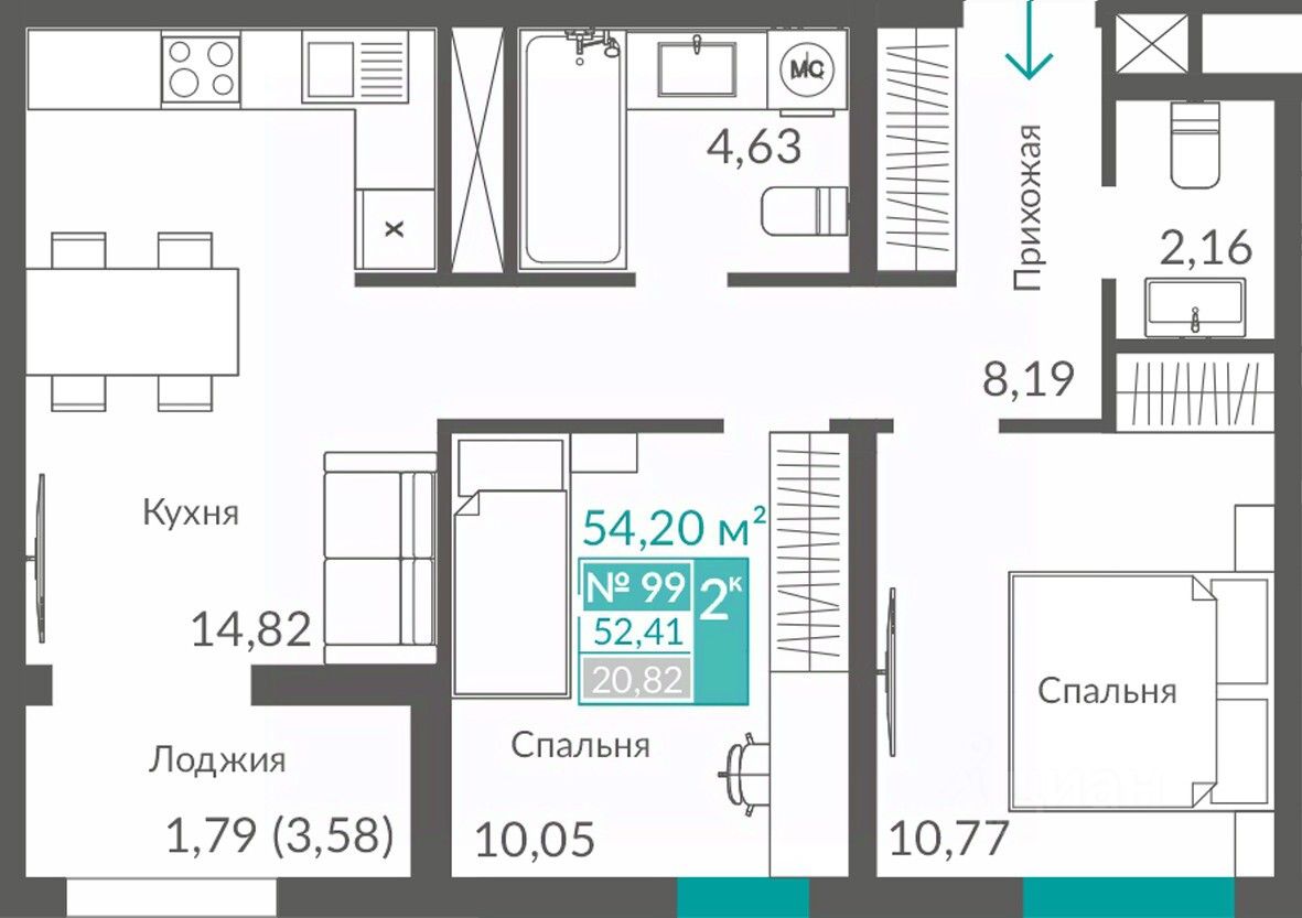 Общая площадь52,41 м2