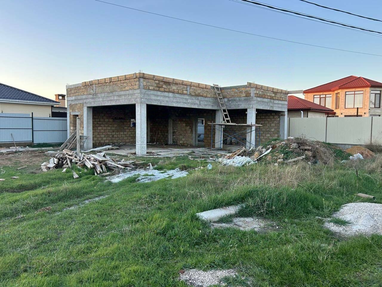 * На участке возведен качественный фундамент и полноценный сейсмоустойчивый каркас будущего дома. Площадь:120 кв м. Односкатная крыша.