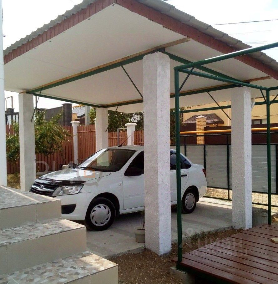 Участок огорожен капитальным дизайнерским забором, сделан въезд и стационарный навес под авто