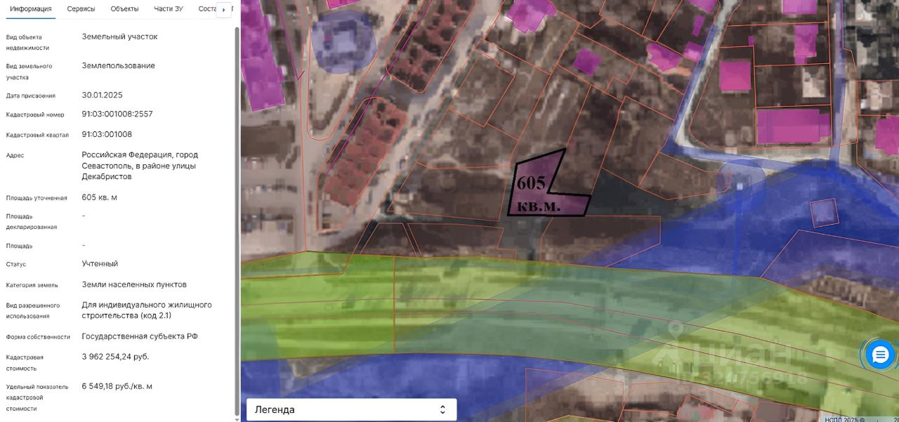 Доброго времени суток. Представляем к покупке ЗУ вдоль улицы Руднева 6,05 сотки ИЖС Об участке: + 605 кв.м., + Кад. номер: 91:03:001008:2557, + ВРИ: Для индивидуального жилищного строительства (код 2.1), + Форма собственности: Государственная субъекта РФ (аренда на 20 лет), + Участок имеет уклон, Инфраструктура: + Участок расположен в густонаселенном районе г. Севастополя, все необходимое в шаговой доступности, + Школы и детские сады, + Магазины, парикмахерские и т.д. , + В 15 минутах пешим шагом ТРЦ Муссон и ТЦ Лаванда, + Остановка общ.