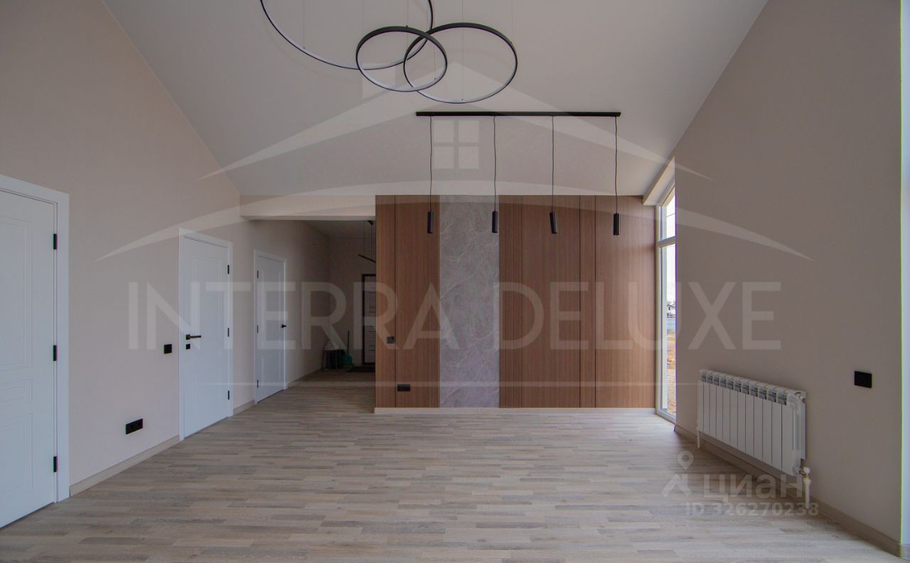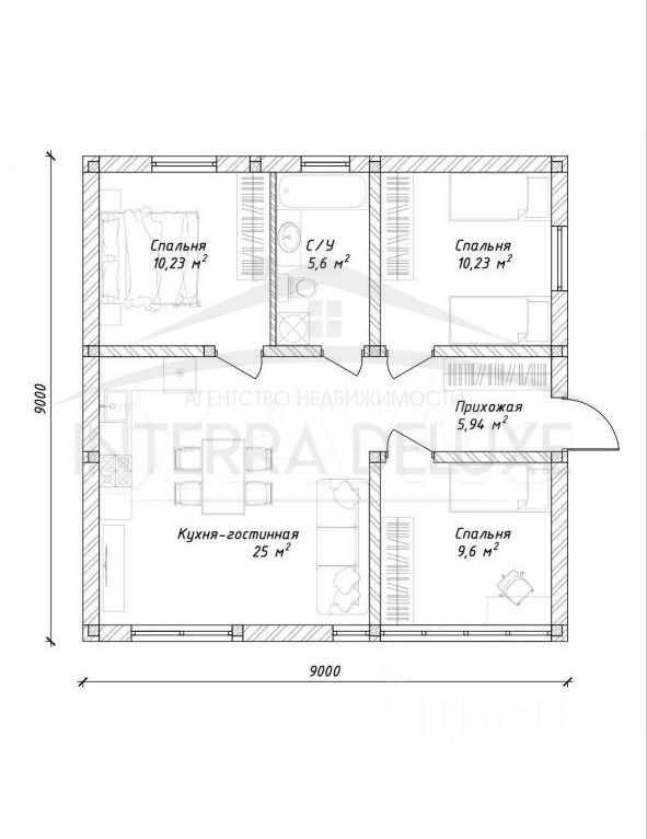 Прихожая, три спальные комнаты, просторная кухня-гостиная с панорамным остеклением, санузел.
