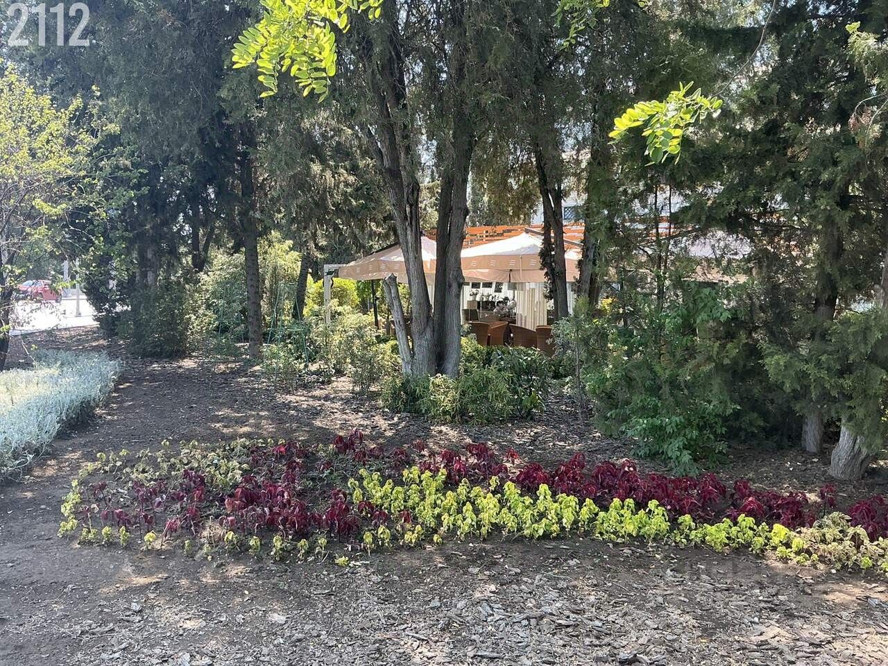 Закрытый. двор. в доме, вечнозеленые деревья, цветы .