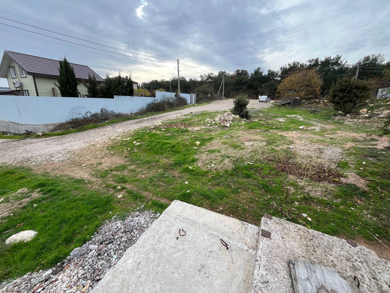 Участок неправильной формы. Практически ровный. Частично огорожен. Есть дом недострой (по документам зарегестрирован как жилой, площадь 90 кв.м. двухэтажный)