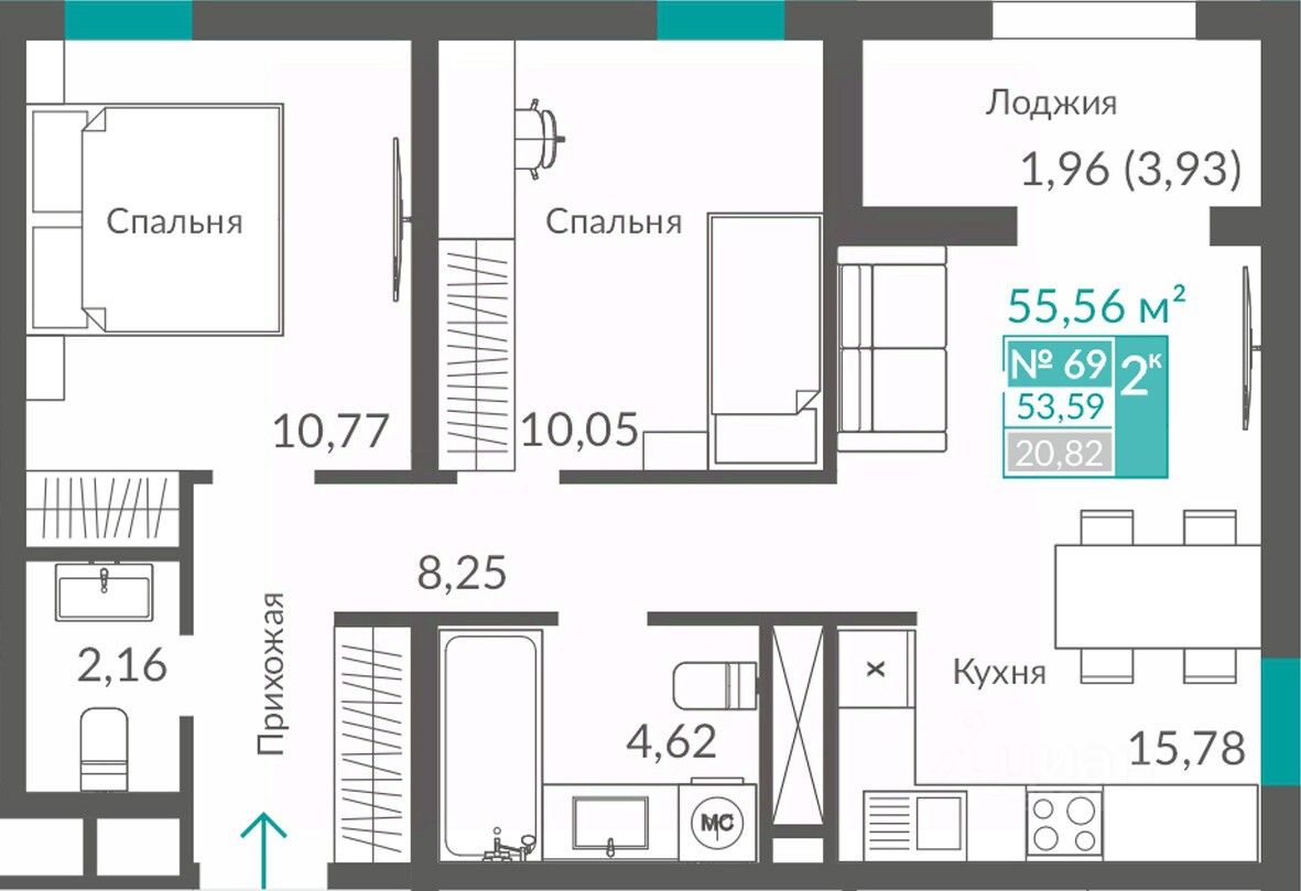 Общая площадь53,59 м2