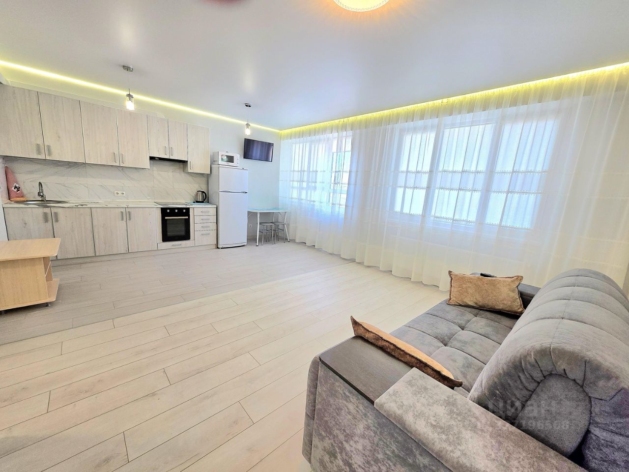 Сдам просторную светлую квартиру-студию с современным евро ремонтом на длительный срок. В квартире есть всё необходимая мебель и бытовая техника для комфортного проживания: кондиционер, холодильник, стиральная машина, телевизор, 3 шкафа, большой удобный диван. Ванная комната совмещённая, оформлена в современном стиле. Из окон открывается приятный вид на город. Квартира расположена на 4 этаже с пассажирским лифтом. В подъезде чисто и ухоженно. Парковка открытая во дворе, что обеспечивает удобство для владельцев автомобилей. Комфортный и яркий ЖК Доброгород, в котором находится квартира напоминает мини-город, со всеми удобствами и чистым и ухоженным двором.
